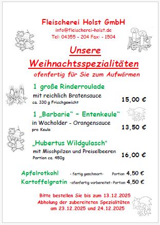 | Heiligabend 24.12.: 7:00 - 12:00 Uhr geöffnet | ||||